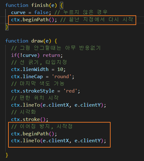 아울러 finish( ) 함수에서 끝나는 지점에서 다시 beginPath( )를 적용해 줘야 경로를 재설정하여 그려질 수 있습니다.