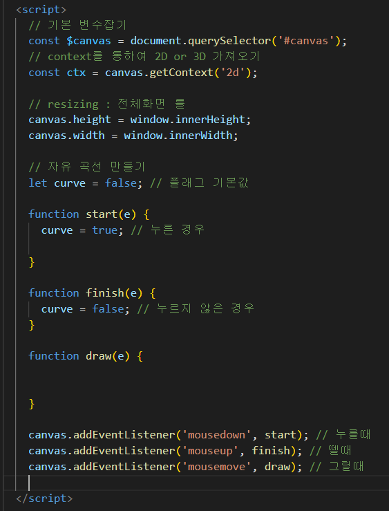이제는 마우스 이벤트를 하기위한 기본구조를 만들 예정인데 자바스크립트에서 연습했던 플래그변수를 이용합니다. 즉, 곡선을 그리지 않는다는 것을 기본 false로 놓고 진행합니다.