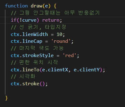 가장 중요한 그리는 기능을 반영하기 위해서는 대부분의 Canvas 실행은 draw( )함수에서 진행합니다. 이벤트 기능이기 때문에 괄호안에 매개변수 e를 사용합니다.